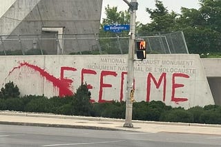 In early December 2025 in the city of Ottawa, Canada a former City of Ottawa lawyer went on trial for painting ‘FEED ME’ on Canada’s ‘National Holocaust…