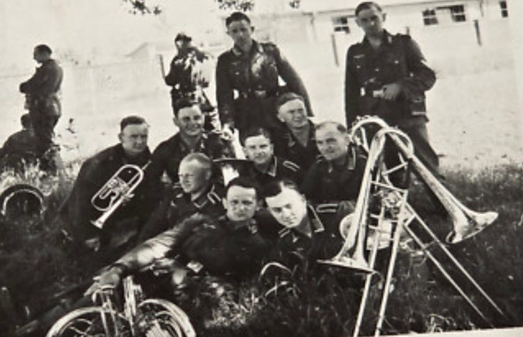 We can see how odd this is by looking at this rare photo of a German Wehrmacht band in field uniform during the Second World War where they aren’t wearing their dress uniform epaulette wings: